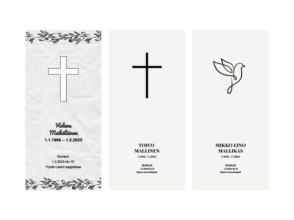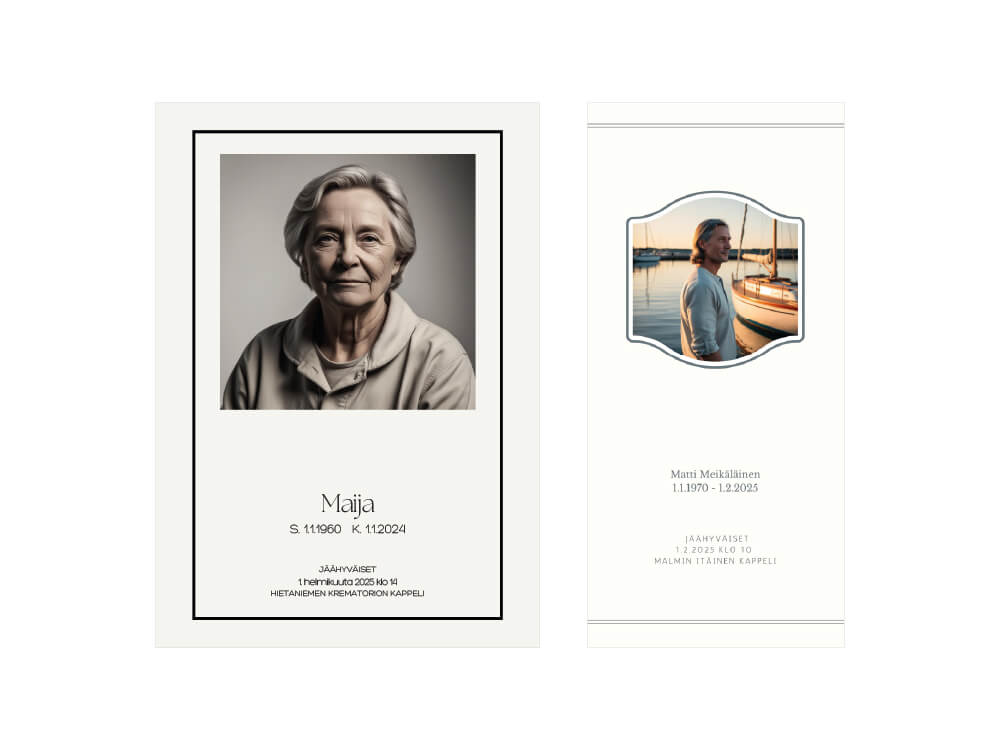 Hautauspalvelu Kaihon malleissa on käsiohjelmia risti-, lintu- ja purjeveneen kuvilla sekä omalla kuvalla. Oma kuva voi olla esimerkiksi kuva rakkaasta maisemasta.
