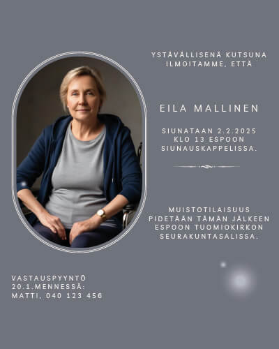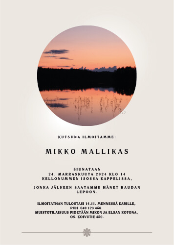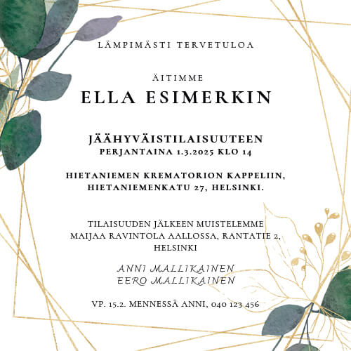 Oheisista malleista voi valita pohjan ja toimittaa kutsuun tulevan tekstin ja mahdollisen kuvan Hautauspalvelu Kaiholle. Asiakas saa kutsukortin jpg-tiedostona vieraille jaettavaksi. Tarvittaessa autamme asiakkaitamme kutsujen lähettämisessä.